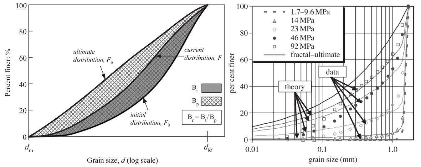 Quantitative descriptions of the degree of grain crushing and tracking grain size evolution was mainly attempted in geotechnical engineering and geomorphology communiteis. Hardin (1985) hypothesized that all particles in a sample of soil could be crushed to fines (particles with size less than 0.074 mm) under sufficiently high stresses. This was, however, not support by the observation that fault gouge materials which have experienced extreme compression and shearing exhibit a self-similar GSD characterized by a fractal dimension of 2.6 (Sammis et al., 1987), corroborating the fragmentation theory of Turcotte (1986):