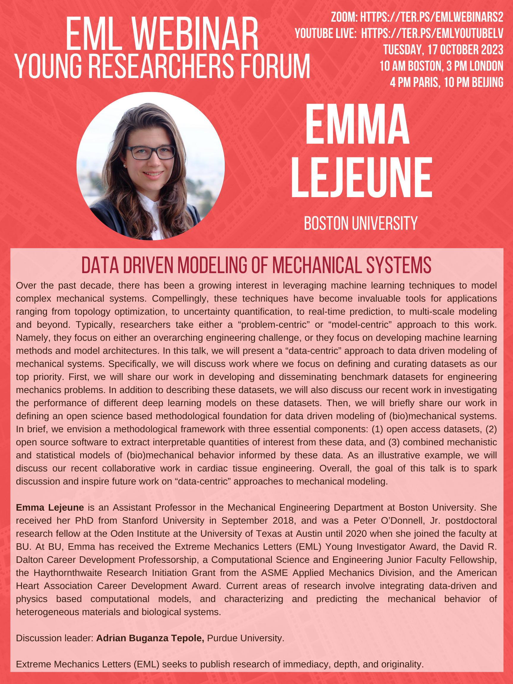EML Webinar (Young Researchers Forum) on 17 October 2023 will be given by Emma Lejeune at Boston University via Zoom meeting