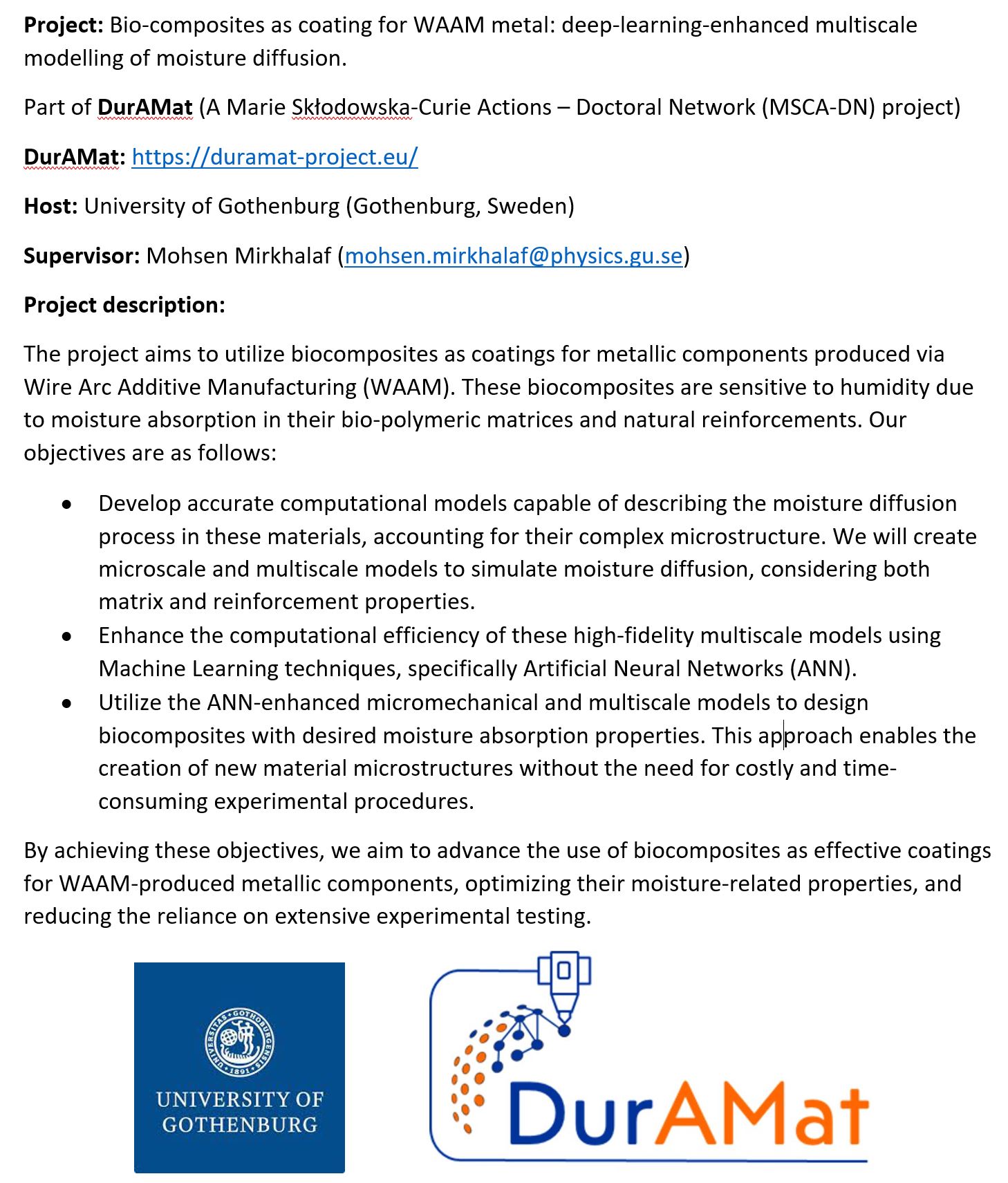 We are looking for a PhD student for a Eueopean (Marie Skłodowska-Curie Actions Doctoral Networks (MSCA-DN)) project: https://duramat-project.eu/