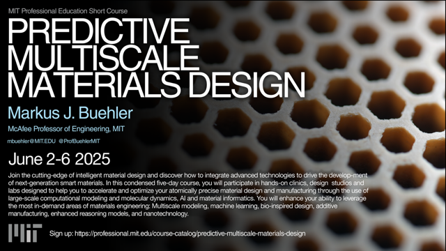 TL;DR: An in-person, high-impact week of deep technical lectures, hands-on labs, interactive clinics, networking events, and participant talks—all focused on the future of materials design using tools like physics-based generative AI, multi-agent AI, molecular modeling, and precision manufacturing. Participants will earn an official MIT certificate. Academics can apply for a fellowship that covers part of the course fee. Please contact mbuehler [at] MIT.EDU.