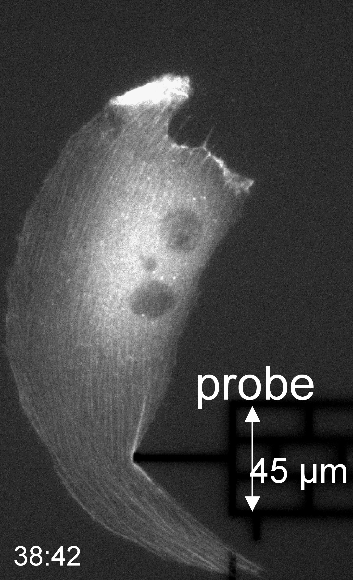 We report the loading and unloading force response of single living adherent fibroblasts due to large lateral indentation obtained by a two-component microelectromechanical systems (MEMS) force sensor. Strong hysteretic force response is observed for all the tested cells. For the loading process, the force response is linear (often with small initial non-linearity) to a deformation scale comparable to the undeformed cell size, followed by plastic yielding. In situ visualization of actin fibers (GFP) reveals that during the indentation process, actin network depolymerizes irreversibly at discrete locations to form well-defined circular actin agglomerates all over the cell, which explains the irreversibility of the force response. Similar agglomeration is observed when the cell is compressed laterally by a micro plate. The distribution pattern of the agglomerates strongly correlates with the arrangement of the actin fibers of the pre-indented cell. The size of the agglomerates increases with time as ta with a= 2~3 initially, followed by a=.5~1. The higher growth rate suggests influx of actin into the agglomerates. The slower rate suggests a diffusive spreading, but the diffusion constant is two orders of magnitude lower than that of an actin monomer through the cytoplasm. Actin agglomeration has previously been observed due to biochemical treatment, gamma-radiation, and ischemic injury, and has been identified as a precursor to cell death. We believe, this is the first evidence of actin agglomeration due to mechanical stimuli. The study demonstrates that living cells may initiate similar functionalities in response to dissimilar mechanical and biochemical stimuli.