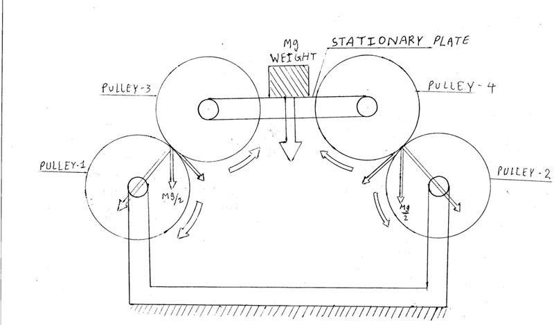 Cross section of pulley1, pulley2 , pulley3 and pulley4 are as shown in figure(energy.jpg). Center of Pulley 1 and pulley 2 are placed on same horizontal line. Center of pulley 1 and pulley 2 are fixed. Pulley 1 and pulley 2 can rotate about their center. Center of pulley3 and pulley4 are also placed on one horizontal line. Pulley 3 and pulley 4 can also rotate about their center. Center of pulley 3 and pulley4 are joined with one stationary plate.Pulley 3 and pulley4 are simply supported on pulley1 and pulley2.Now we apply some load or weight on stationary plate. Finaly this force is applied on pulley 1 and pulley 2 in vertical downward direction because pulley 3 and pulley4 are simply supported on pulley 1 and pulley2. Tangential componants of these force helps to rotate pulley1 , pulley2 , pulley3 and pulley4. If you want to remove pulley3 and pulley4 , stationary plate is directly simply supported on pulley1 and pulley2 then also pulley1 and pulley2 can be rotated.