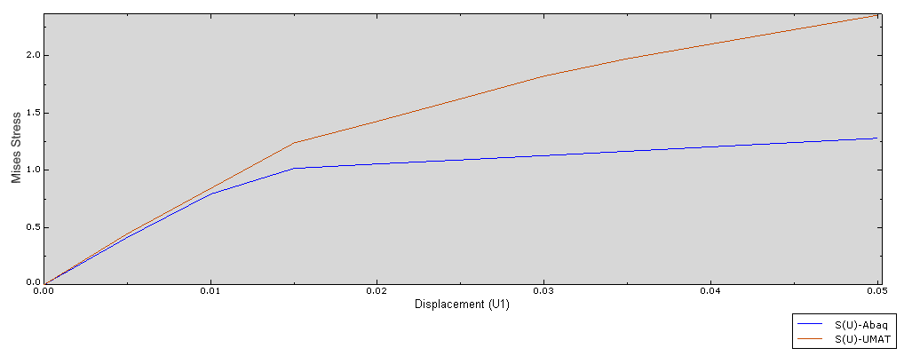 Mises) in field of paper mechanics. I am currently testing my UMAT against Abaqus implemented model on single plain strain element, fixed on one face and loaded with prescribed displacement on one node. So far my UMAT correctly predicts elastic behavior on both isotropic and orthotropic materials. I've encountered problem with plasticity (as early as on Mises phase testing). Routine seems to correctly predict plastic behavior until some threshold level of strain (displacement), beyond that point Abaqus/UMAT results diverge. I figured out that this means that base algorithm is working well (I compared results of elastic predictor-plastic corrector scheme on debug level with other available routines) but there seem to be some kind of bug. I suspect that it may be cause of bad performance on finite-strains but I don't know how to include them. I've done some testing on Anisotropic Elasticity+Hill Criterion but results seem to diverge from the very beginning (well that could be result of change in orientation material matrix while in UMAT it is constantly the