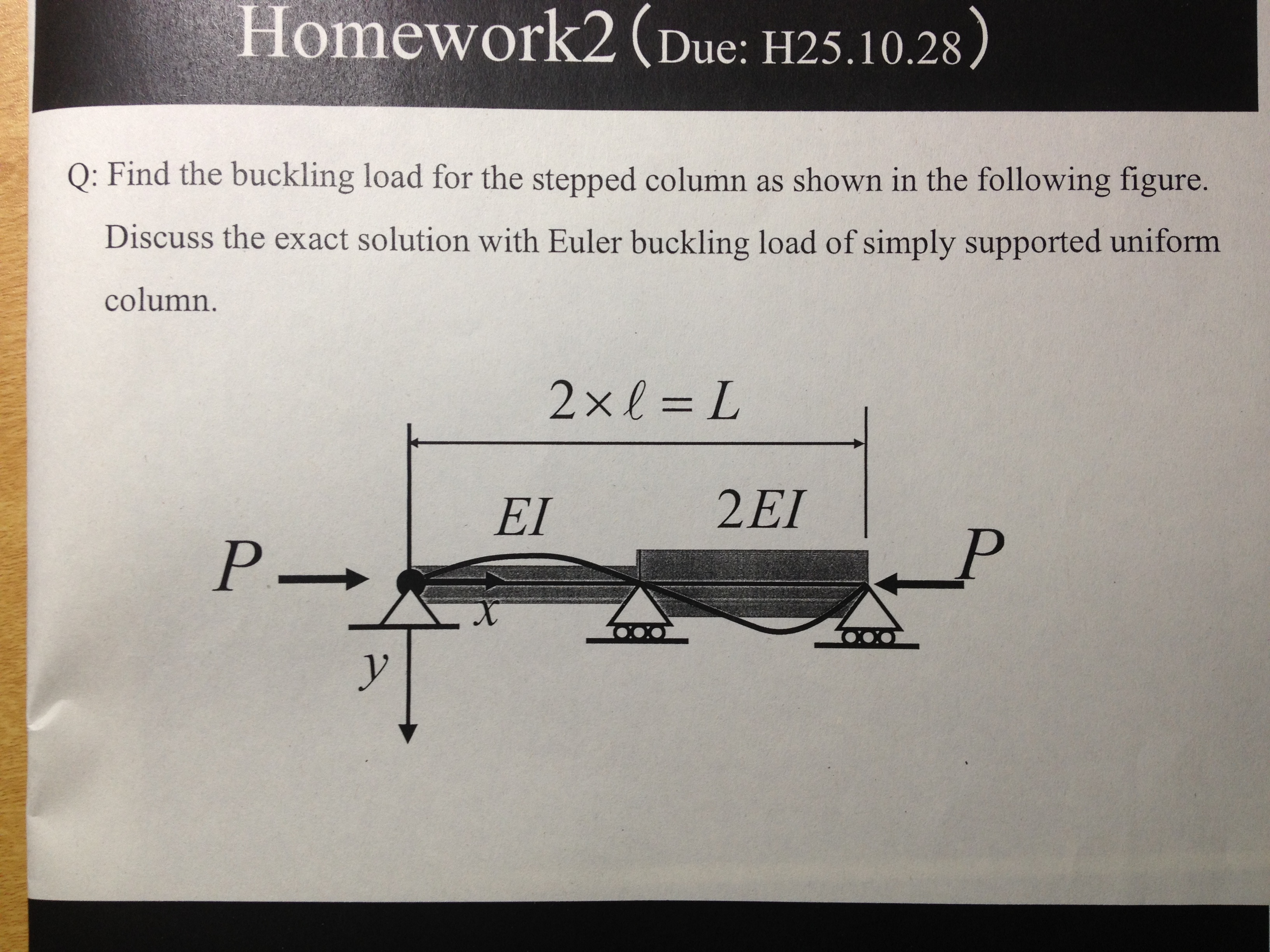 At the moment I'm trapping in finding a solution to determing the critical/buckling load for this two-stepped column as shown in the picture. In the middle it has an extra support. Could anyone please help me with this exercise, or give me some advice on further references?