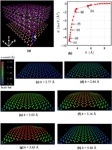 Fig: (a) The initial configuration of the simulated graphene–polymer system. (b) Variation of cohesive energy with h. (c)–(h) Deformation of the graphene sheet at various values of h. The corresponding positions of (c)–(h) in (b) are indicated by arrows.