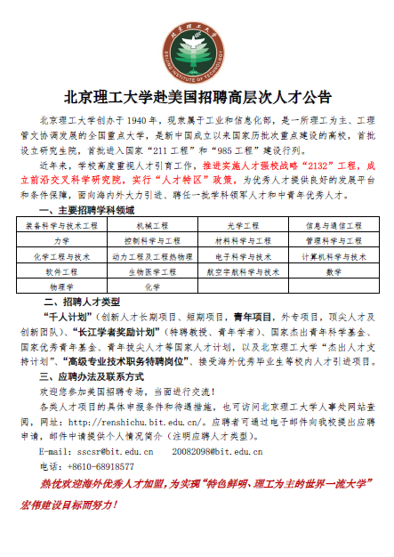 为延揽海外优秀人才,北京理工大学定于2015年10月再次赴美国举办人才招聘, 具体安排如下: