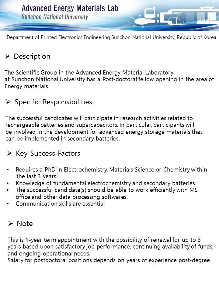 at Sunchon National University has a Post-doctoral fellow opening in the