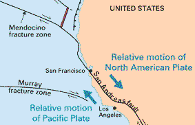 The San Andreas Fault in California accommodating the relative motion of the North American Plate and the Pacific plate.