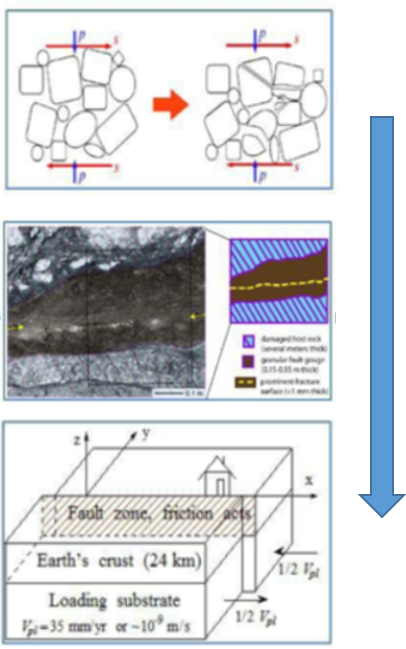 Earthquake processes span a wide range of length and time scales. Individually each scale is best described by a different model resolution. We adopt a multiscale approach (illustrated below) which begins on the left with the identification of key microscopic processes (such as granular rearrangements and grain breakage), transitions in the center to medium scale models (constitutive laws with shear banding), and ends on the right with large scale dynamic rupture simulations, retaining what is important from smaller scales and transferring it to larger scales. On the largest scale, Earthquakes are modeled as an initial-boundary value problem. Equations of motion are solved in the bulk given (i) boundary conditions on the fault surface emerging from subscale granular dynamics, and (ii) initial values of displacement, velocity and stress at the onset of rupture.