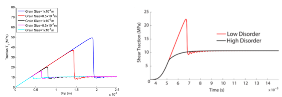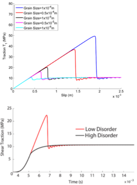 Some examples for Brittle to ductile transition in sheared gouge layers from 2D continuum viscoplasticity simulations using STZ theory [Ma and Elbanna, 2016] (Top) Effect of grain size: smaller grain size leads to more ductile response. (Bottom)Effect of disorder: Less initial disorder leads to brittle response.