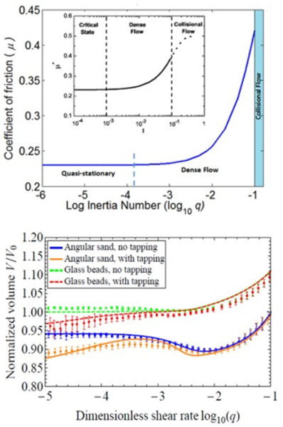 Examples of successful applications of STZ theory that go beyond classical rate and state law. (Top)Predictions of STZ theory for the rheology of sheared granular system [Elbanna and Carlson, 2014]. Insert shows results from discrete element simulations [daCruz et al., 2005]. (Bottom) Predictions of STZ theory for volume changes in sheared granular system with angular grains in the [Lieou et al., 2014]. Discrete points represent experimental observations of van der Elst et al. [2012].