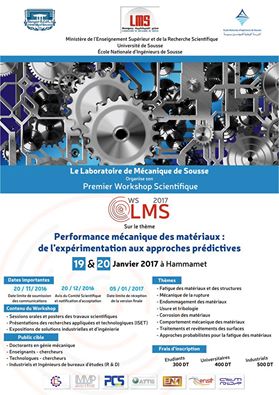 The Mechanical Laboratory of Sousse (LMS) of the National School of Engineers of Sousse intends to organize annual scientific workshop on one of the four research themes identified by the laboratory teams. This first Workshop is proposed by the LMS team: “Fatigue of Materials and Structures”. The proposed theme is ” Mechanical performance of materials: From experiments to predictive approaches”. It will take place on January 19-20, 2017 at Hammamet, Tunisia in patronage with: Sousse Techno-park, Tunisian Association of Mechanics, Tunisian Association of Innovative technologies of Sousse, Mechanical Engineering Laboratory of ENIM and Laboratory of Material Mechanics and Processes of ENSIT.