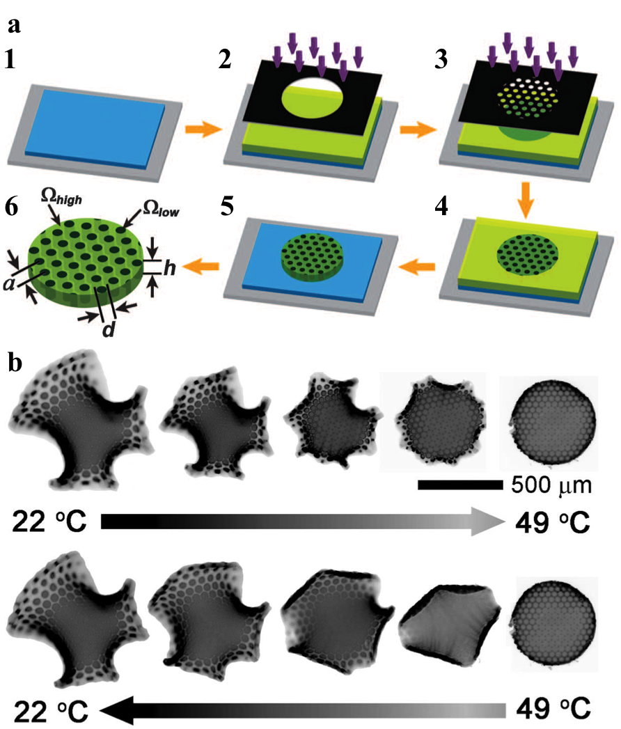 Figure 2. (a) Schematic illustration of the fabrication process for embedded nonuniform rigidity. (1) On a silicon wafer coated with a sacrificial layer, (2) the photosensitive polymer film is cast and exposed to a small dose of UV light through the first photomask and subsequently (3) a large dose through the second photomask. (4) The patterned film is (5) developed to remove uncross-linked material and (6) immersed in aqueous solution to release it from the substrate and induce swelling, where Ω indicates areal expansion ratio. (b) Reversible thermal actuation of patterned sheet but through different pathways [13].