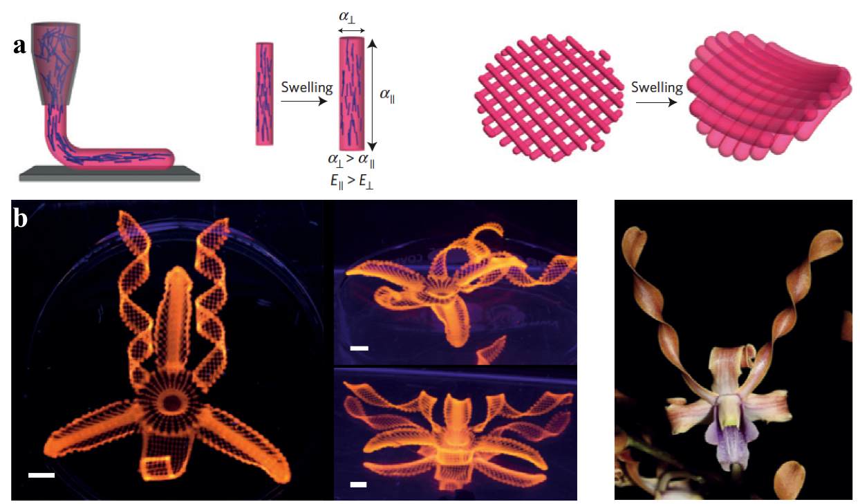 Figure 3. (a) Schematics of the flow-field induced alignment of cellulose fibers during direct ink writing and subsequent effects on anisotropic stiffness E and swelling strain alpha, which result in anisotropic deformation behavior. (b) A biomimetic-swollen structure of a flower (left panel) demonstrating a range of morphologies inspired by a native orchid (right panel) (scale bars 5 mm) [14].