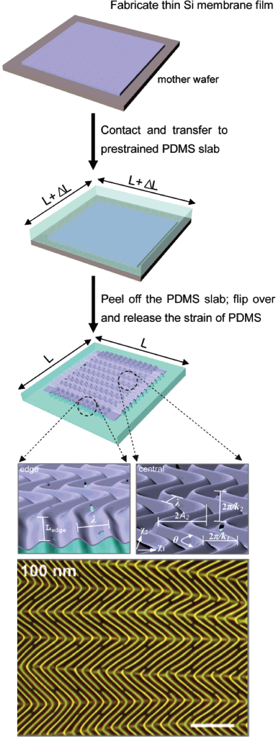 Figure 4. Schematic illustration of steps for fabricating two-dimensional, “wavy” semiconductor nanomembranes on a prestrained elastomeric substrate. At the bottom is an optical micrograph of 2D wavy structures in silicon nanomembranes [16].