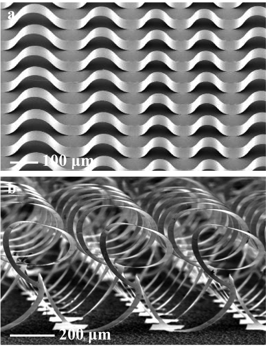 Figure 5. SEM images of (a) an array of buckled Si membranes from linear 2D layout [22] and (b) an array of double layered helices from serpentine 2D layout [24]. Both cases are selective bonding.