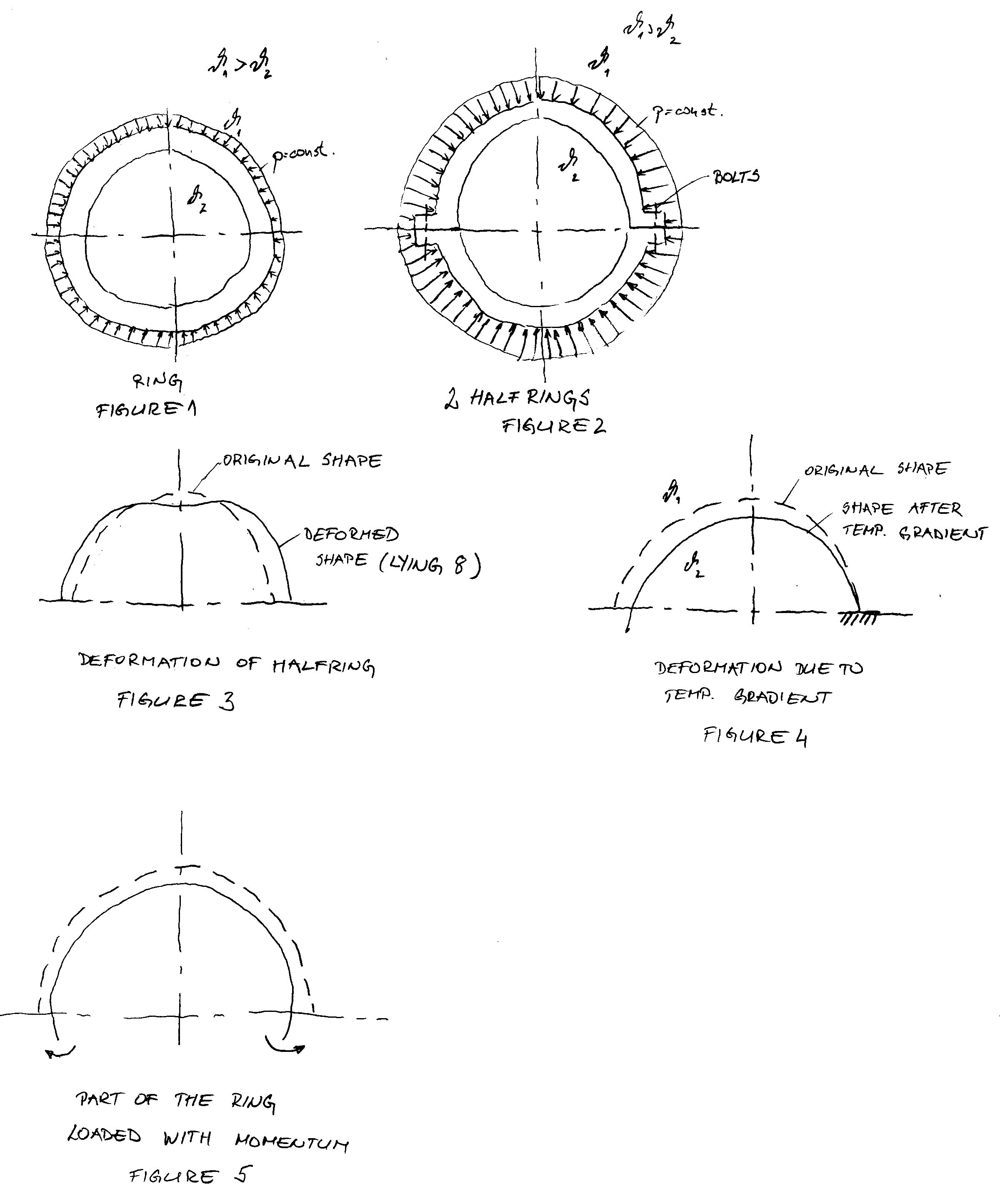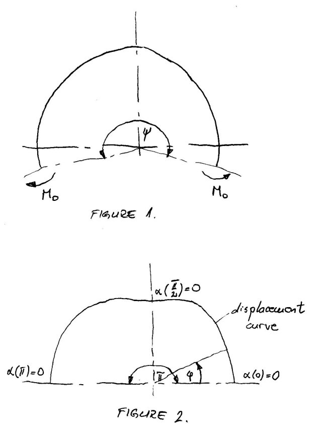 I really expected more from you guys. Let me simplify the problem.Instead of temperature gradient load, let’s analyse part of the ring in cold condition with overall angle y (y>p see attachment Sketch1 from previous comment – Figure 1) and loaded with momentums M0 at the ends. Overall angle of displacement curve has to be p. Boundary conditions are as on Figure 2 (a is angle of the curve on normal).