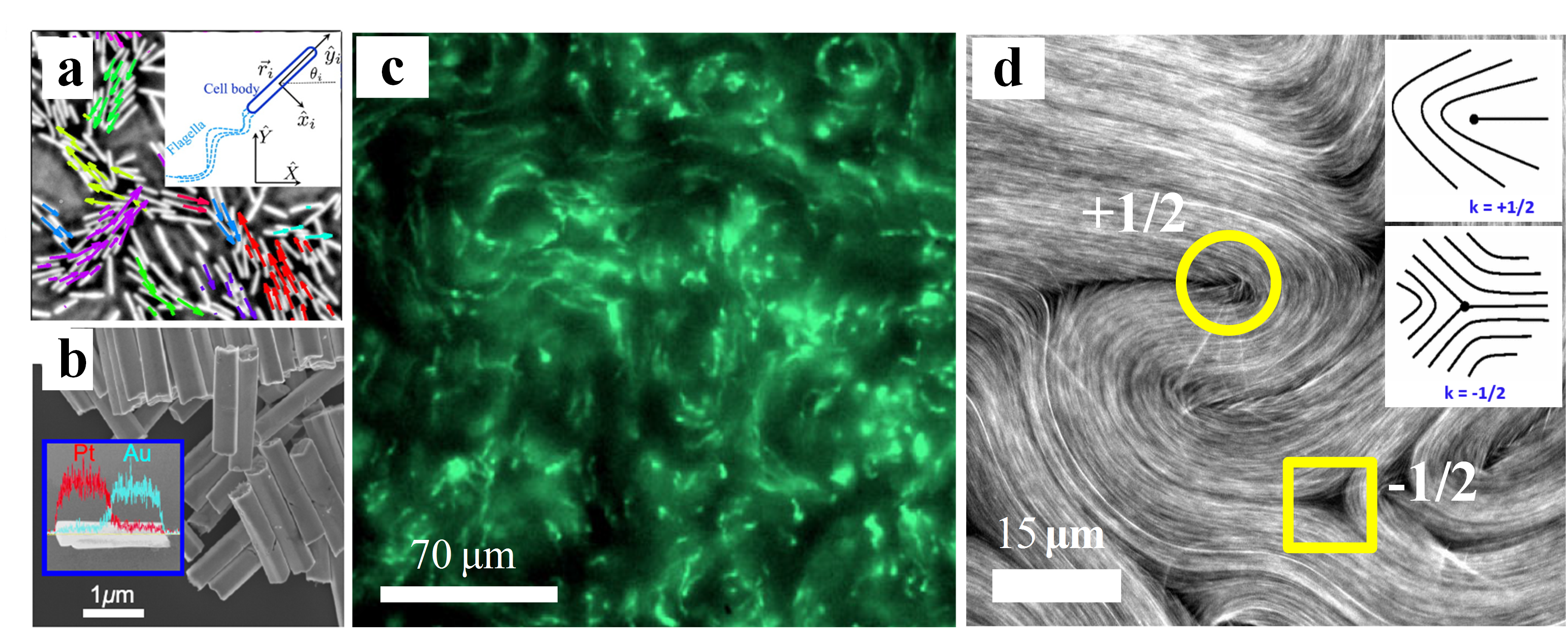 FIG. 1: Examples of active matter systems: (a) Bacterial (Bacillus subtilis) swarm [1]; (b) Self-driven bimetallic particles [3]; (c) Flow field of a bacterial “turbulence” (Bacillus subtilis) [14]; (d) Active liquid crystalline phase of a microtubule (MT)-motor suspension featured by motile disclination defects [9].