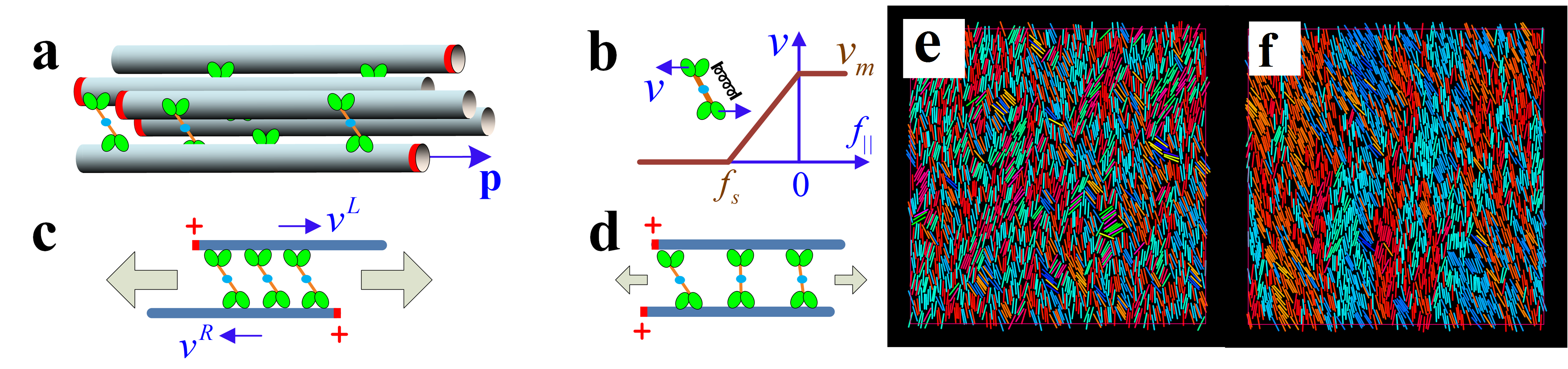 FIG. 2: (a) Schematic of a cluster of polar-aligned and anti-aligned MTs, with plus ends marked by red rings. Motors walk on neighboring MTs, and (b) exert spring-like forces with a piecewise linear force-velocity relation. (c) An anti-aligned MT pair. (d) A polar-aligned MT pair. Grey arrows characterize the magnitude of the extensile stress. (e) System with no crosslinks, illustrating the 2D nematic state. (f) An active system with mobile crosslinks exhibits active flows and formation of polar lanes [15].