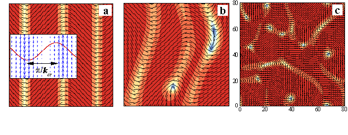 Fig 3: (a) Bending of nematic field lines of a concentrated MT/motor suspension of rod-like particles that are initially aligned in the horizontal direction. Inset: the fluid velocity vector field (blue) and the eigenmode (red line). The separation distance between the adjacent bends characterizes the length scale of the nematic structures. (b) Genesis of disclination defects at late times. (c) Large scale active nematic flows featured by motile disclination defects and incipient crack formation. In (a-c), the vector field represents the nematic director; the background colormap represents the scalar order parameter [15].