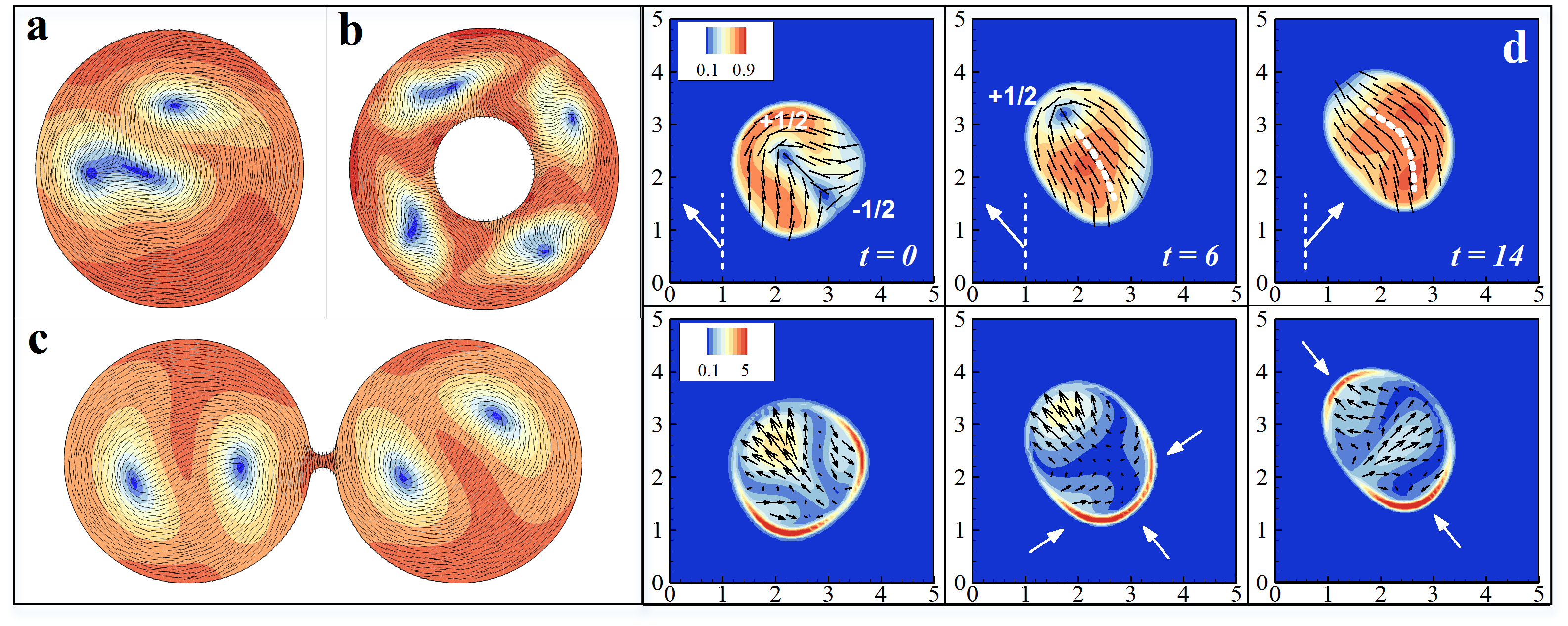 Fig 4: Snapshots of the motile declination defects in a circular disk (a), an annulus (b), and biconcave chamber (c) [26]. (d) Sequential simulation snapshots of a moving droplet driven by collective dynamics of active particles. Top: evolution of particle alignment within the drop. Bottom: force generation [27].
