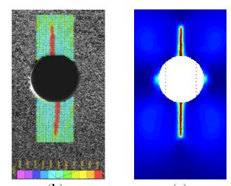 Fig. 7: Crack path evolution near the cylindrical hole (D = 5mm); (a) strain maps obtained with digital image correlation (b) 2D simulation (plane strain), (c) Evolution of the crack length with respect to the resultant stress on the upper boundary, comparison between models and experimental data: (top crack)