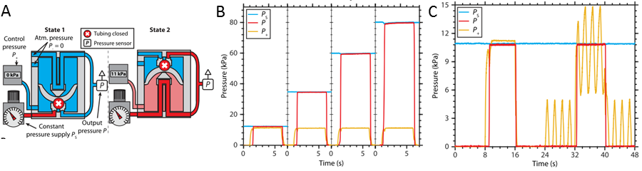 3. A soft switch Figure 2A shows a configuration in which the soft valve acts as a switch between two different pressures [8]. The bottom tube is connected to an air source of constant pressure, and the top tube is connected to atmosphere. After passing through the valve, both tubes are connected to a single output. The top chamber is connected to atmosphere. The state of the valve is controlled by the pressure in the bottom chamber. When this pressure exceeds the snap-forward pressure of the membrane, it snaps upwards and connects the output of the valve to the source of constant pressure (Figure 2A,B). When the pressure in the bottom chamber decreases below the snap-back pressure, the membrane snaps back and the output of the valve connects to atmosphere (Figure2A,B). The pressures at which the valve switches can be controlled by designing the material and geometry of the valve [8]. Because the membrane is large compared to the tubes it can even control pressures that are larger than the snap-forward pressure of the membrane (Figure 2B). This function is difficult to achieve with microfluidic valves. Because the output of the switch is binary and hysteresic, the switch can also filter noise in the control signal as long as the noise is small enough not to trigger the instability (Figure 2C). This function is comparable to that of a Schmitt-trigger in digital signal processing.