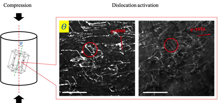Figure 1. <c+a> dislocation can only be activated when the angle between the c-axis angle and loading direction is within a few degrees.