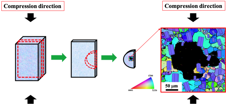 Here, we demonstrated correlative microscopy is a powerful tool to link the loading direction, crystal orientation, and dislocation characteristics in individual grains. As shown in Fig. 2, the example is from the paper [18], for a standard cubic compression sample, the straight edge is always parallel to the loading direction. We extracted one slice from the compression cube via cutting and polishing, then punched the slice into a disc. Instead of punching into a perfect circular shape, one straight edge is reserved, which is parallel to the loading direction. After the twin-jet electropolishing to cause perforation, electron backscatter diffraction (EBSD) was performed on the TEM foil using the straight edge as one coordinate axis in the inverse pole figure (IPF) map. In this case, the compression direction of the sample is preserved in the IPF map from this special sample preparation method. Note that this technique could also be easily extended to tensile specimens.