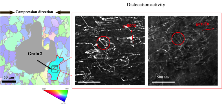 Utilizing together various microscopy tools designed for different length scales, researchers have enabled characterization studies that are otherwise impossible. Here are a number of examples. TEM and atom probe tomography (APT) correlative microscopy is already a well-established method to study nanoprecipitates, grain boundaries, and dislocations [19]. Han et al. correlated TEM and SEM to study different types of grain boundaries and defects interactions [20]. Wang et al. correlated EBSD and TEM to study local region twins and dislocations interaction [21]. Recently, Xu et al. correlated EBSD, DIC, and TEM to study active slip modes in hexagonal materials [22]. In this work, we correlated TEM and EBSD to further consider the Schmid factor of individual grains, which enables the investigation of <c+a> dislocations activities after close-to-c-axis compression. EBSD mapping allows for a fast crystal orientation identification of all grains of interest and precise navigation in TEM to locate grains. TEM study of dislocations was then carried out with prior knowledge of Schmid factors of targeted grains from the EBSD maps.