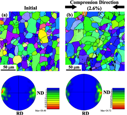 Hot-rolled highly textured Mg AZ31 initial sample and the 2.6% compressed samples along the normal direction (ND) were prepared using the method above. The global EBSD IPF maps were firstly done to confirm the strong c-axis texture along with ND (Fig. 5). For the ND compression sample, the c-axis texture did not change significantly after the compression, as shown in Fig. 5b. This result indicates dislocation-mediated plasticity is the dominant deformation mode.