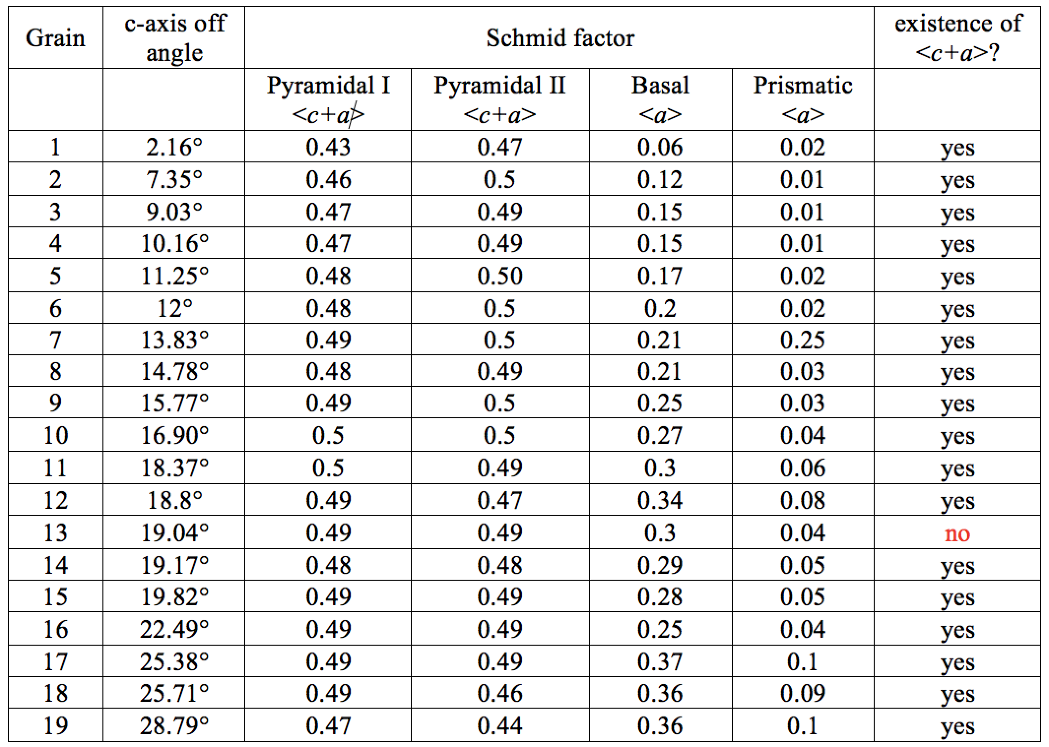 Table. 1 The c-axis off-angle and the corresponding Schmid factor (Pyramidal I, II <c+a>, basal <a> and prismatic <a> dislocation) and the existence of <c+a> dislocation of all 19 selected grains based on TEM images in ND compression samples, respectively.