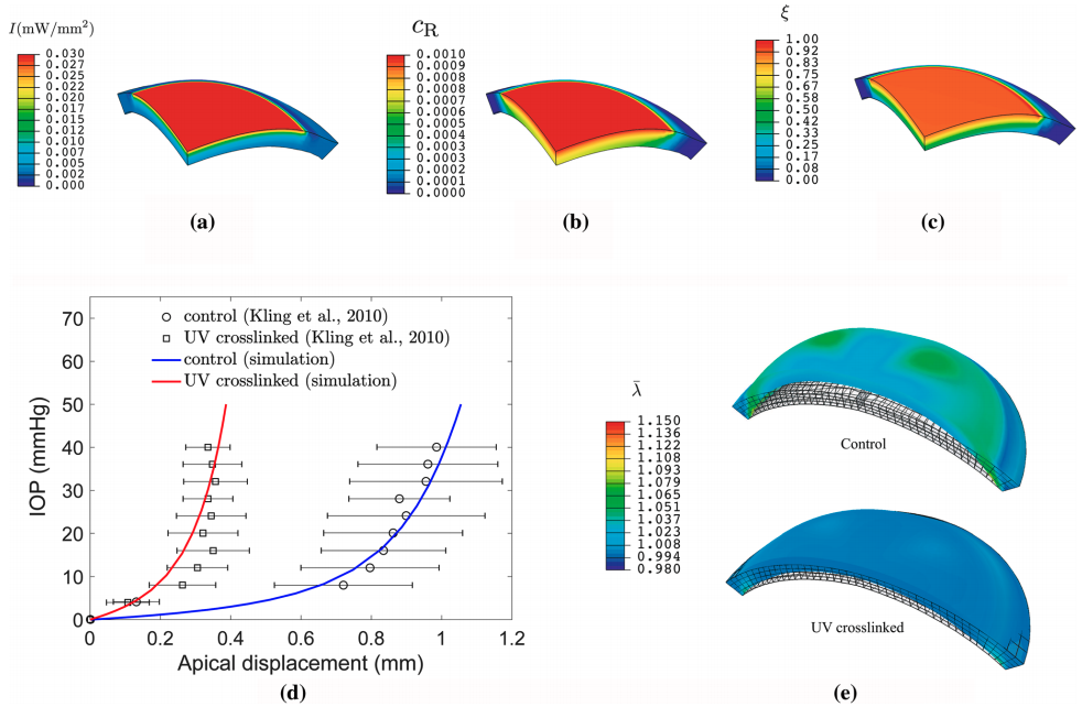 The UV cross-linking technique applied to the cornea is a popular and effective therapy for eye diseases such as keratoconus and ectatic disorders. The treatment strengthens the cornea by forming new cross-links via photochemical reactions and, in turn, prevents the disease from further developing. To better understand and capture the underlying mechanisms, we develop a multi-physics model that considers the migration of the riboflavin (i.e., the photo-initializer), UV light absorption, the photochemical reaction that forms the cross-links, and biomechanical changes caused by changes to the microstructure. Our model is calibrated to a set of nanoindentation tests on UV cross-linked corneas from the literature. Additionally, we implement our multi-physics model numerically into a commercial finite element software. We also compare our simulation against a set of inflation tests from the literature. The simulation capability allows us to make quantitative predictions of a therapy’s outcomes in full 3-D, based on the actual corneal geometry; it also helps medical practitioners with surgical planning.