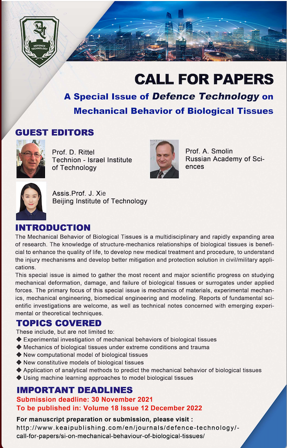 Submitted by D.Rittel on Thu, 06/10/2021 - 10:39 Prospective authors are welcome to submit! http://www.keaipublishing.com/en/journals/defence-technology/call-for-papers/si-on-mechanical-behaviour-of-biological-tissues/ Attachment Size Screen Shot 2021-06-10 at 13.38.59.png 776.92 KB Log in or register to post comments1334 views