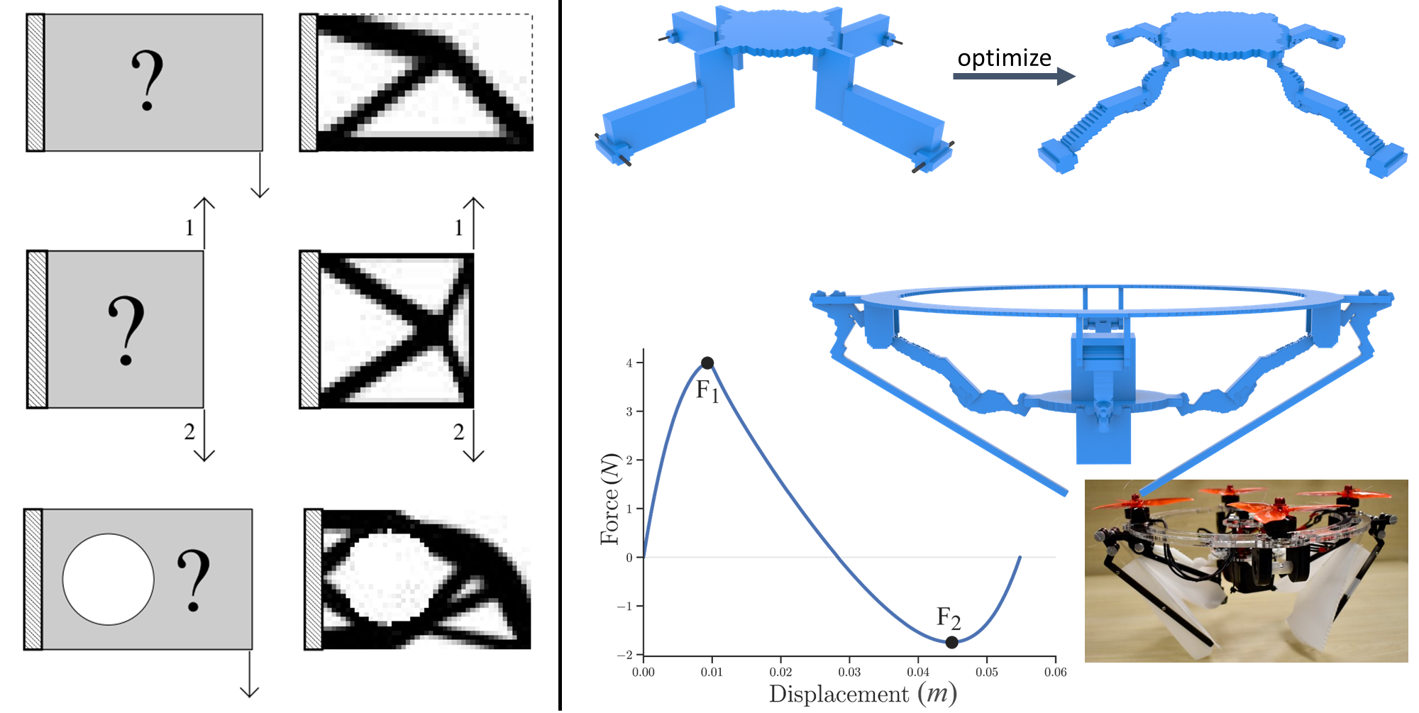 Figure 2. Examples results from topology optimization. Left: Results from [24] showing the results of optimizing material density for minimum compliance in a cantilever with varying loads. Right: Results from [26] using topology optimization to design a bistable beam in a dynamical hybrid aerial vehicle.