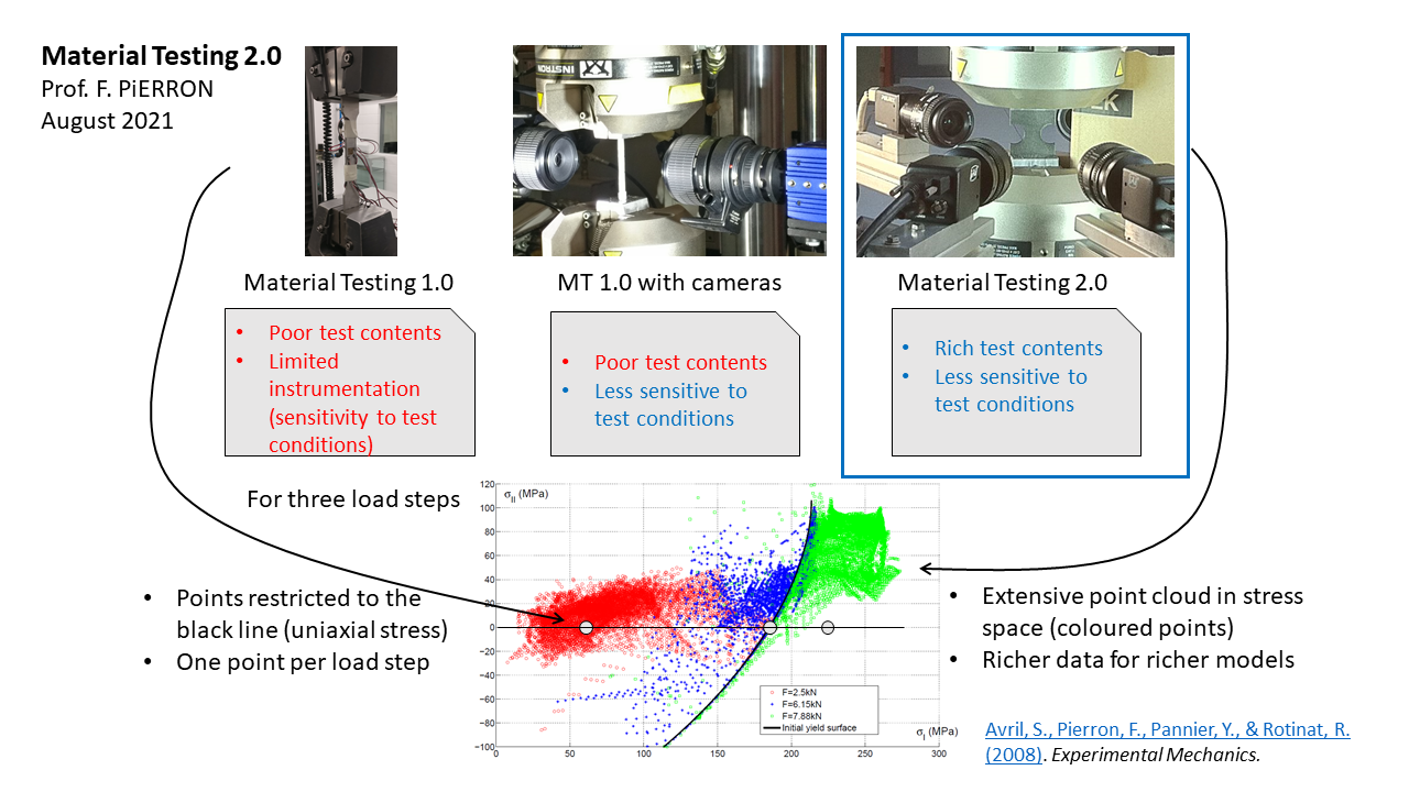 As for data inversion, there is scope for progress indeed, but the current tools (FE updating, VFM) are already sufficiently mature to establish new MT2.0test configurations now. Regardless of the technical nitty-gritty, I think a vast space of improvement is in the very formulation of constitutive material models. For anisotropic plasticity for instance, models for yield surfaces are closed, i.e., the model predicts the behaviour for any combination of stress components. This is because the identification based on statically determinate tests only puts one point in the stress space for each test. With MT2.0, we have a point cloud, so it would be possible to formulate a yield surface using B-spline interpolation for instance, which would provide very robust data in the space activated by the test. But this would not provide any information elsewhere. This may be seen as a weakness but I think it is a strength as if you want data in a particular part of the stress space, you should perform a test providing data there. Uniaxial tests do not tell you anything about a biaxial stress state. Extrapolation from a certain experimental window to another one where tests are not available is very risky...