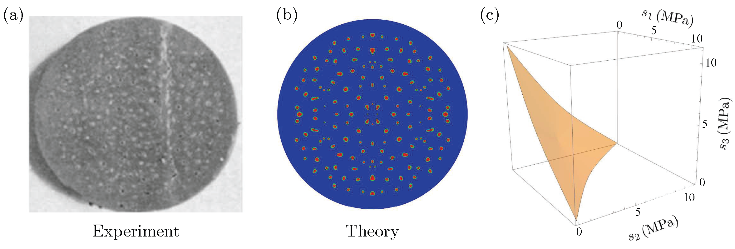 Figure 5. Nucleation of fracture in poker-chip experiments on natural rubber. (a,b) Comparison between an experiment of Gent and Lindley [8] and the theoretical predictions in [17] for the post-mortem image of the midplane of a poker-chip specimen of rubber D with diameter-to-thickness ratio =33. (c) Plot of a Drucker-Prager strength surface, fitted to the experimental data of the rubber D studied by Gent and Lindley [8], in the space of all three principal nominal stresses .