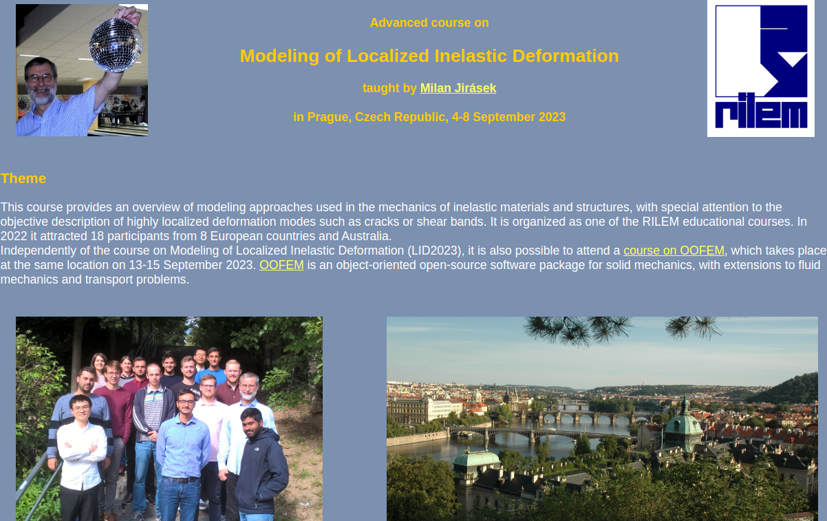 The 2023 edition of the advanced course on Modeling of Localized Inelastic Deformation, given by Milan Jirásek, takes place from 4 to 8 September at the Faculty of Civil Engineering, Czech Technical University in Prague.