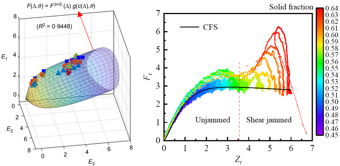 Figure 3: Left: critical fabric surface identified through true triaxial shear on a polydisperse assembly (Wen and Zhang, 2022a). Data points in the figure represent the critical fabric data of samples with different initial states. Right: fabric evolution paths of initially unjammed, bi-disperse granular samples (Wen and Zhang, 2023). Depending on the initial density (indicated by the color bar), some samples remain unjammed throughout the shearing process, while others develop certain shear stress and are thus considered to be shear jammed. All fabric paths converge to the CFS at steady state.