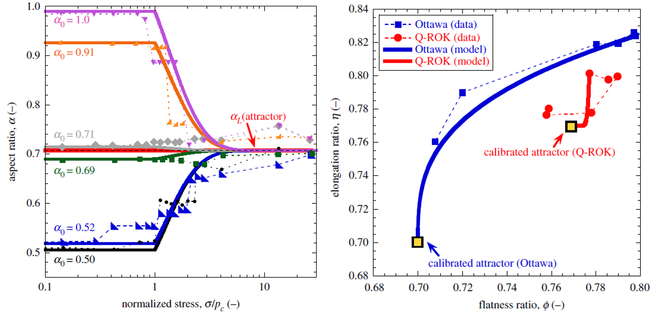 Constitutive modeling. In soil mechanics, grain shape is known to impact the mechanical properties of sand including stiffness, strength, and packing density (Alshibli and Cil, 2018; Cho et al., 2006; Liu and Yang, 2018). The identification of a potential grain shape attractor gives another motivation to incorporate grain shape descriptors in soil constitutive models. However, as of now, models that incorporating grain shape and its dynamic evolution during breakage are still rare. To my knowledge, the only attempt is made recently by Buscarnera and Einav (2021). They showed that such shape attractors can be incorporated in CBM via additional shape-related internal state variables (ISVs). The shape ISVs are introduced in the stored elastic energy of the granular assembly in a way similar to the breakage variable. This dependency is motivated by assuming a linear scaling between the elastic strain energy and the surface area of the particles. Perturbation of the grain shape thus causes energy release or gain of the system, which must be balanced with the energy dissipation and the external work input to the material element. By proposing a coevolution law between grain shape and size, the evolution of grain shape towards an ultimate attractor is predicted throughout the course of loading. The theory has a one-descriptor formulation based on aspect ratio and a two-descriptor version using the elongation ratio and flatness ratio (i.e., the Zingg plane) as shape ISVs. The predicted shape evolution path agrees well with experimental and DEM data from sands with different initial grain morphologies (Fig. 9). It is expected that, as growing experimental data on shape attractors emerge, more theoretical developments will attempt to incorporate grain shape in the continuum description of granular materials.