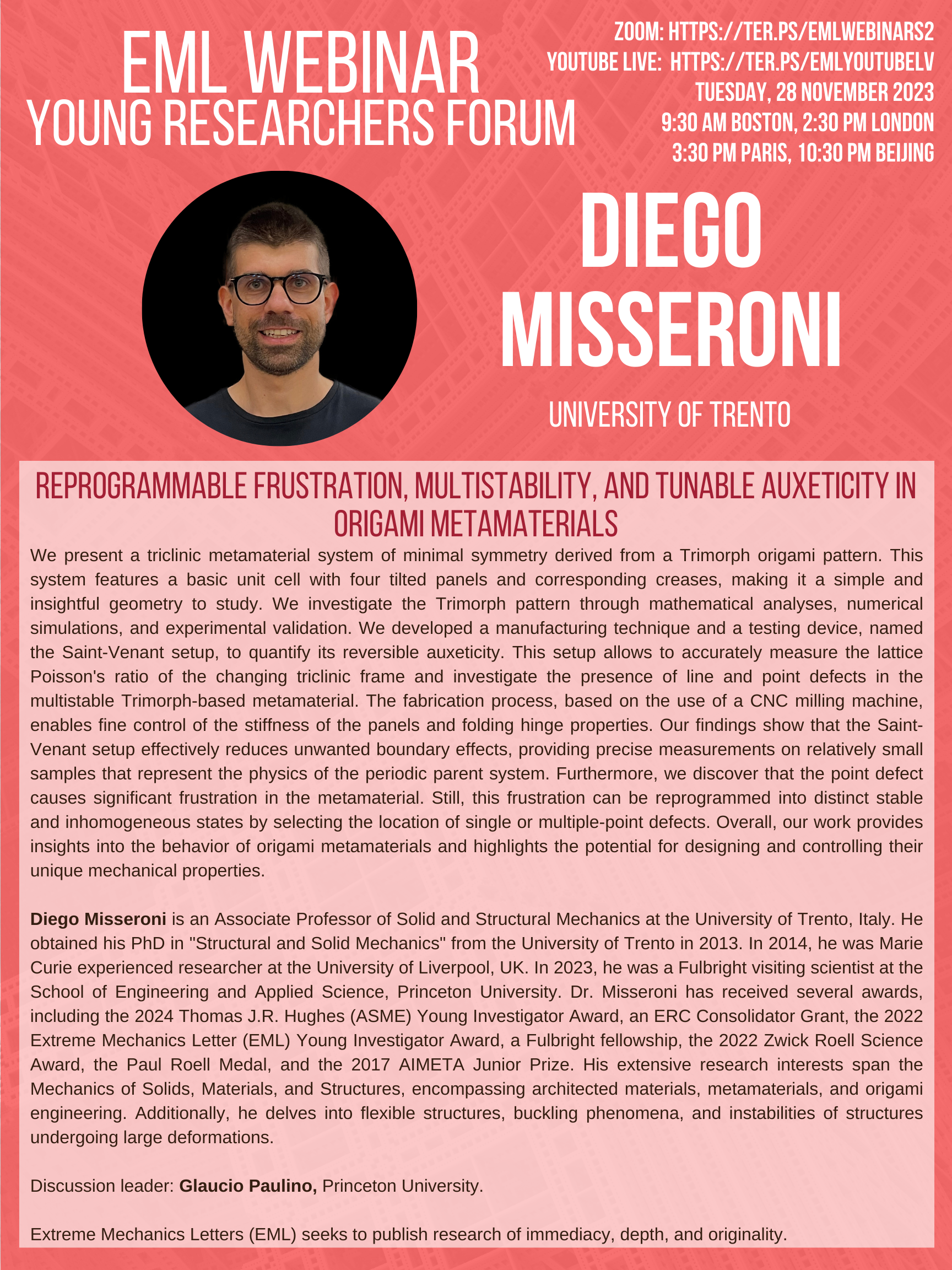 EML Webinar (Young Researchers Forum) on 28 November 2023 will be given by Diego Misseroni at University of Trento via Zoom meeting