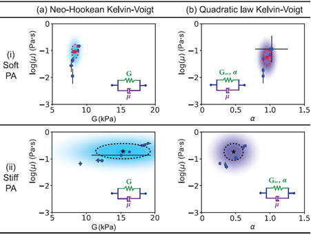 Figure 5. Fitted material viscoelastic properties of both (i) soft and (ii) stiff polyacrylamide hydrogels using (a) neo-Hookean Kelvin–Voigt and (b) quadratic law Kelvin–Voigt models. Dashed circles and shaded areas represent one- and two-times standard deviations, respectively.