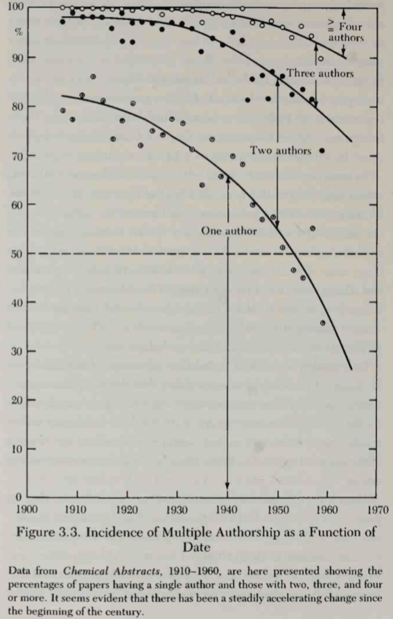 One of the founding fathers of bibliometrics, Derek De Solla Price, already spoke about the decline of single-author papers in the 1960s (I attach the figure below). In my opinion, papers with a single name remain the most beautiful!