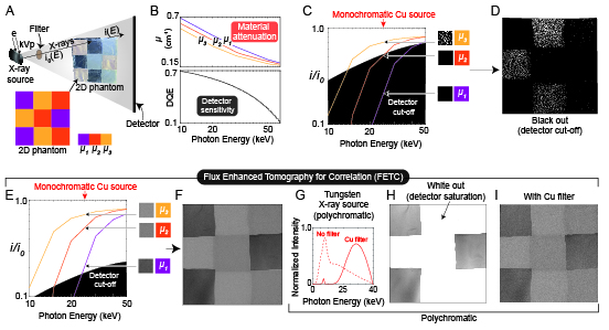 Fig. 1: Overview of the principle of Flux Enhanced Tomography for Correlation (FETC) on a 2D phantom made from polymers with similar X-ray attenuation. Figure adapted from [1].