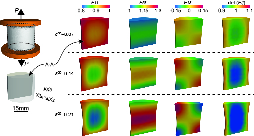 Fig. 2: Tension of a cylindrical specimen of silicone rubber (aspect ratio 1:1) and FETC measurements showing various components of the deformation gradient and detF_ij (local volume change) at three different levels of remote strain ε∞, Figure adapted from [1].