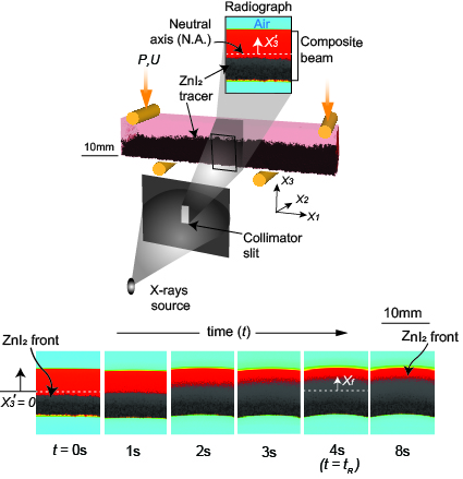 Fig. 3: A composite beam made from silicone rubber with a tracer (ZnI2) on one side exhibits tracer movement from the compressive side to the tensile side upon bending, as demonstrated in the time-stamped images. Adapted from [1].