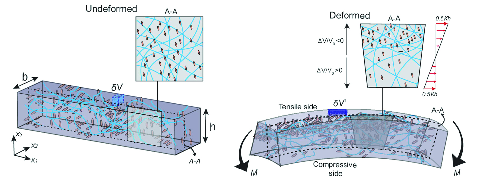 Further investigations into the deformation behaviour of Silicone rubber revealed the presence of a mobile phase within the material (Fig. 3). This phase, composed of un-crosslinked polymer within the crosslinked network, moves in response to deformation gradients, inducing local volume changes while maintaining overall incompressibility. A composite Silicone rubber beam with an X-ray tracer demonstrated that the mobile phase migrates from compressive to tensile regions under bending, confirming its existence and mobility (illustration in Fig. 4).