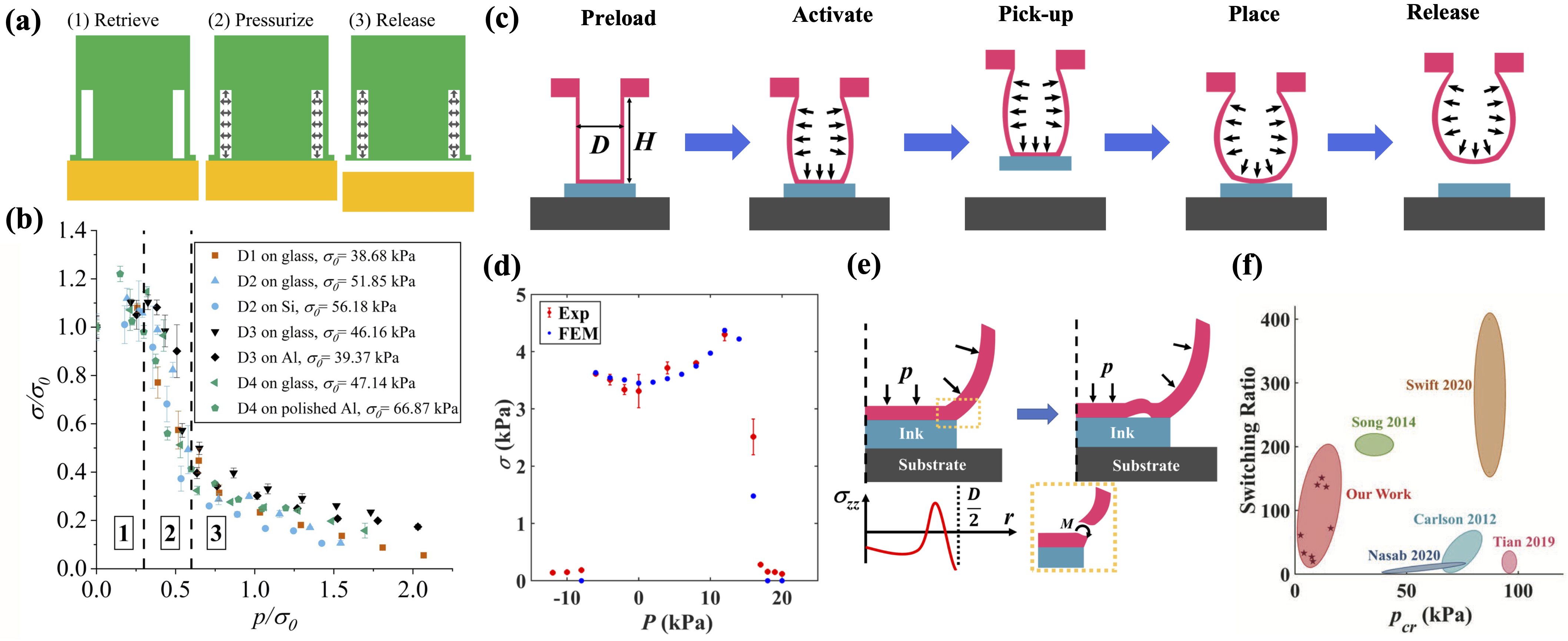 Figure 4: Working principles and performances of tunable adhesives based on SPM using either (a) a soft pillar containing an annular chamber, or (c) an SHP. (b) Adhesion of the soft pillar containing an annular chamber against various surfaces under pressure [8]. (d) Adhesion of an SHP under negative and positive pressure [9]. (e) Crack initiates from high stress region near edge of SHP under positive pressure. (f) Performance of tunable adhesion using SHP in terms of adhesion switching/change ratio and activation pressure pcr compared with other studies [9].