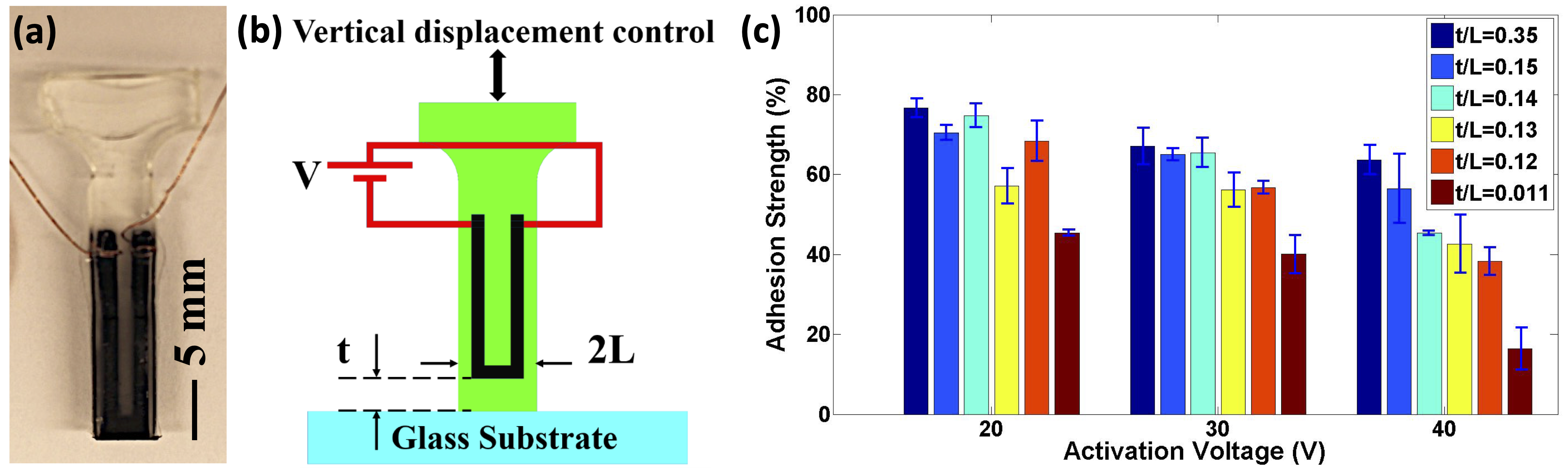 The use of composite structures with stiff subsurface components to control the stress distribution at an adhered interface and thus the dry adhesion strength was proposed and demonstrated by the Turner group [1] using cylindrical pillars with a rigid core and soft shell (Fig. 1a). Initial work showed a ~ 3.5 x increase in dry adhesion through the placement of a stiff core in a compliant polydimethylsiloxane (PDMS) pillar [2]. The Turner group then showed that the adhesion strength could be increased through miniaturization of the pillars by fabricating 200-micrometer diameter cylindrical composite pillars comprised of a stiff core and a soft PDMS shell using photolithography and molding (Fig. 1b) [3]. These smaller pillars have adhesion enhancement of up to 9x and dry (van der Waals mediated) adhesion strengths of >1.5 MPa, which is 15x higher than the gripping pressure provided by vacuum [3]. This work showed the potential for composite structures to achieve high dry adhesion strength, but these structures did not contain an active material and thus the adhesion could not be tuned dynamically.