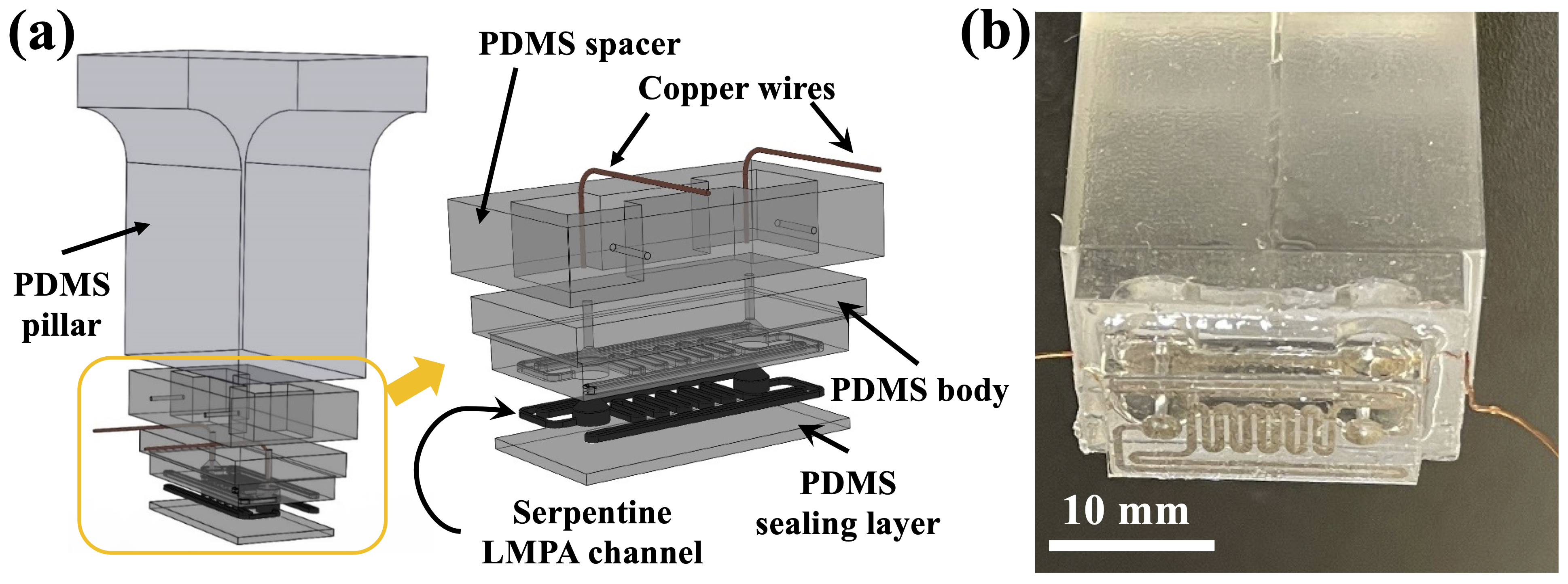 To improve the performance of SSM technology in terms of activation time and activation voltage, the Shan group has also tried embedding thin channels of low melting point alloy (LMPA) into a layer close to the bottom surface of a PDMS pillar to achieve dynamically tunable dry adhesion through SSM (Fig. 3) [7]. Results show that such a device can be activated with 5 V within much shorter time (~ 1 second) due to the high electrical conductivity and much less volume of smart material (LMPA) used, but the adhesion change is much lower (~2x). The reason is that the thickness/height of the smart layer/core turns out to be important to achieve relatively uniform stress distribution on the interface for higher dry adhesion when not activated [7].
